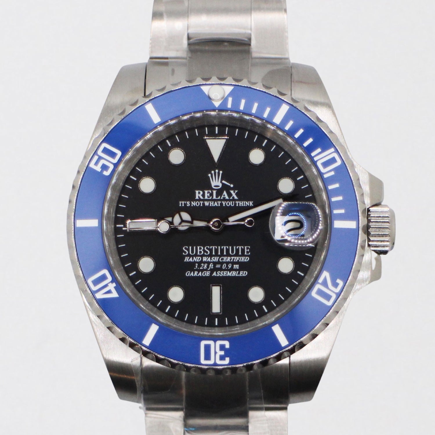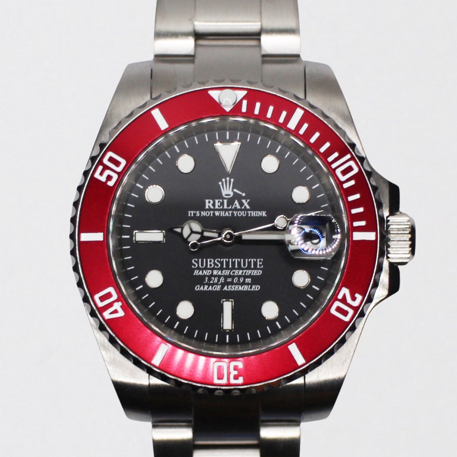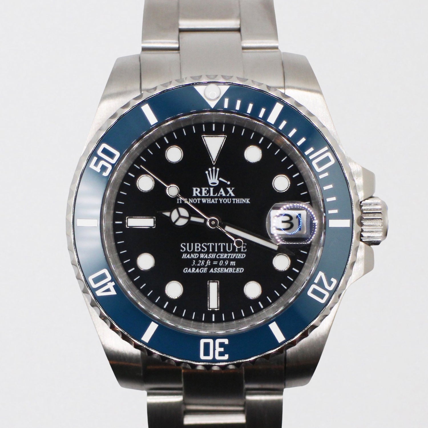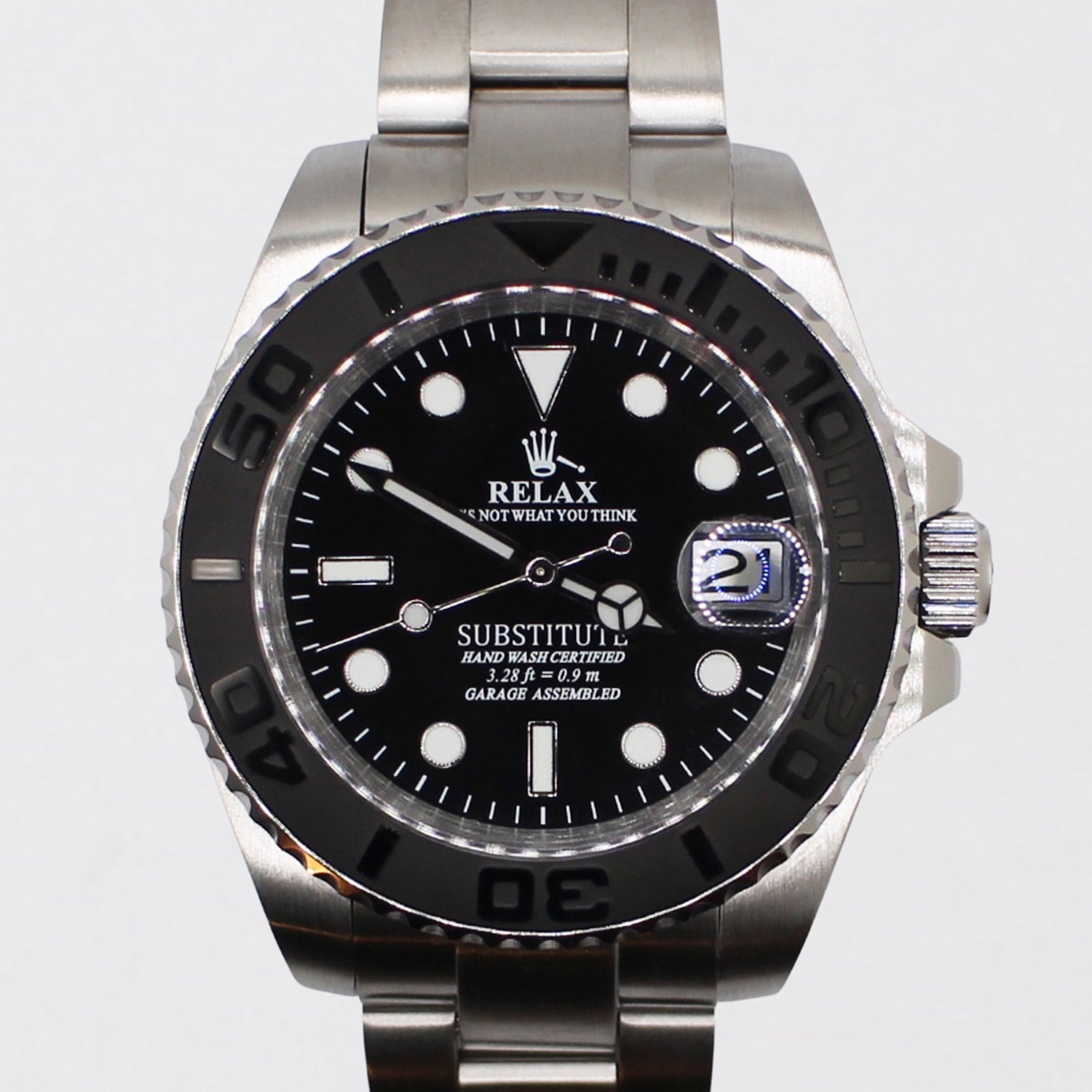 This watch is for people who do not take life too seriously. Relax features a broken crown at the top of the dial and "SUBSTITUTE" text at the bottom of the dial.